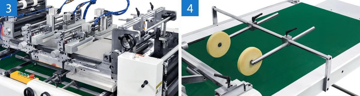 One high-hardness roller circulating glue is used, and the roller basement adopts center- an oriented device to adjust the thickness of glue; with flexo template gluing, the shape can be carved according to the product's need. The roller to install the template has a reference line making the template exact, convenient and fast to install Gluing position can be adjusted more left or more right, the position regulator can adjust it to more front or more behind, and the non-stop machine adjusted the position to all directions needed, The rollers can be disengaged to avoid glue on the belt in case of on paper, Rubber roller can be towed out, cleaning and maintenance are more convenient.