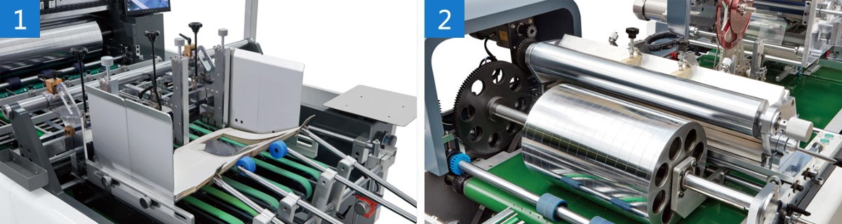 Independent servo control system is adopted Users can adjust the film length as per product size without shutdown. The base material can be adjusted horizontally; Meanwhile, chamfer lines are cut automatically after the paper is positioned accurately according to the above regulations attach the films to the paper box and cut the film via an automatically transverse cutter The precision of film attachment is up to +0.5mm.